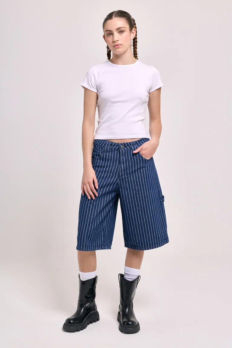Bermuda de tiro medio con diseño de rayas verticales. Presenta una estructura clásica de cinco bolsillos, pierna recta con largo hasta la rodilla y cierre frontal, ofreciendo una opción versátil para combinar en looks casuales y urbanos.