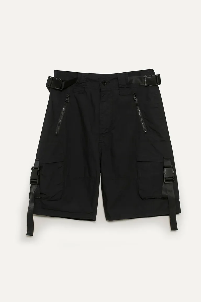 Bermuda de estilo cargo con tiro medio, diseño con elástico en la parte posterior de la cintura y sistema de ajuste en laterales. Presenta bolsillos funcionales, cierres integrados, detalles de hebillas estilo mochila y cintas de nylon. Una prenda versátil ideal para combinar con tops o buzos oversized en diversos outfits urbanos.