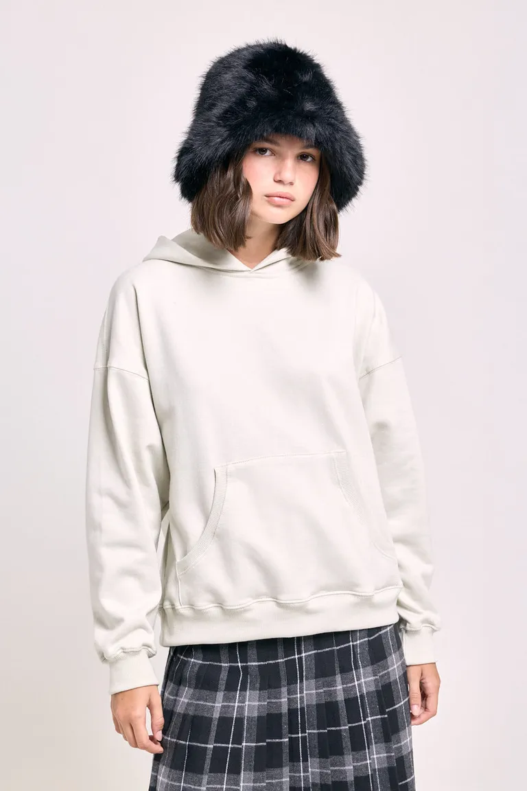 Buzo canguro de calce holgado con capucha integrada y bolsillo frontal tipo canguro. Diseño de estética urbana con mangas largas y terminaciones en puños, ideal para combinar en equipos casuales y versátiles durante todo el año.