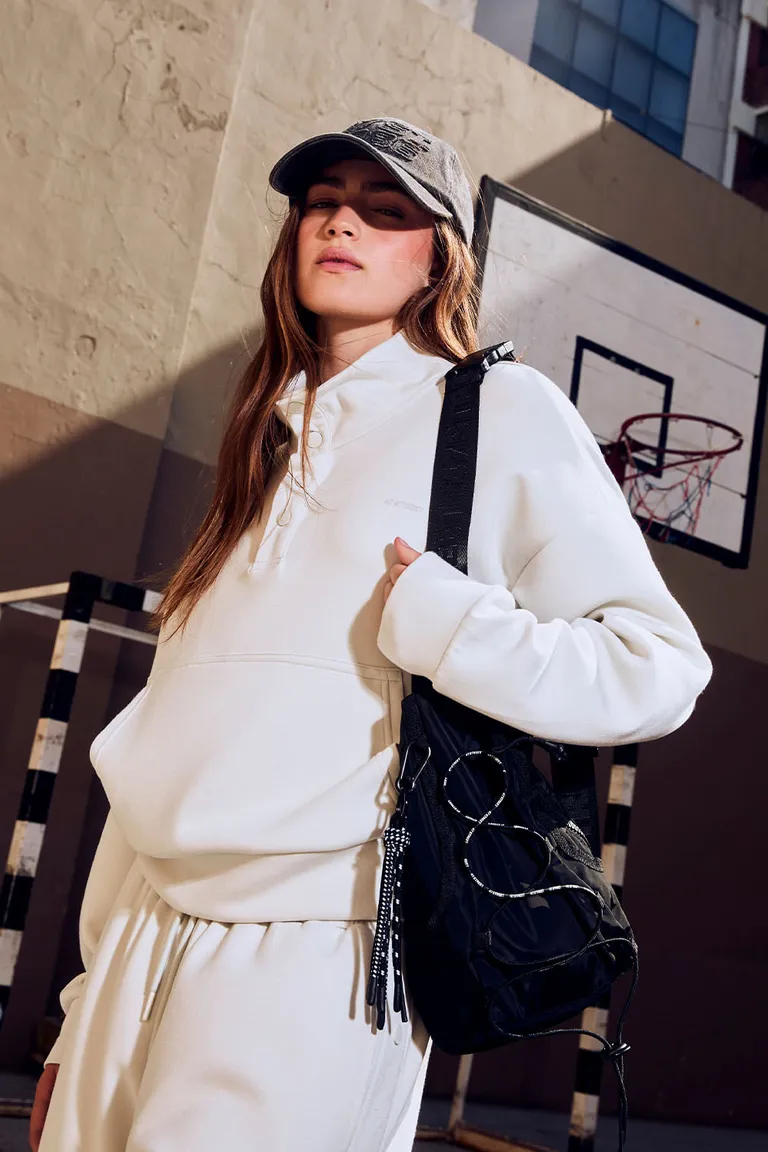 Buzo de cuello alto con diseño de manga larga, cuenta con detalles de broches metálicos y un práctico bolsillo canguro en la parte frontal. Presenta el logo de la marca estampado, ofreciendo una opción versátil y relajada para completar tus outfits urbanos diarios.