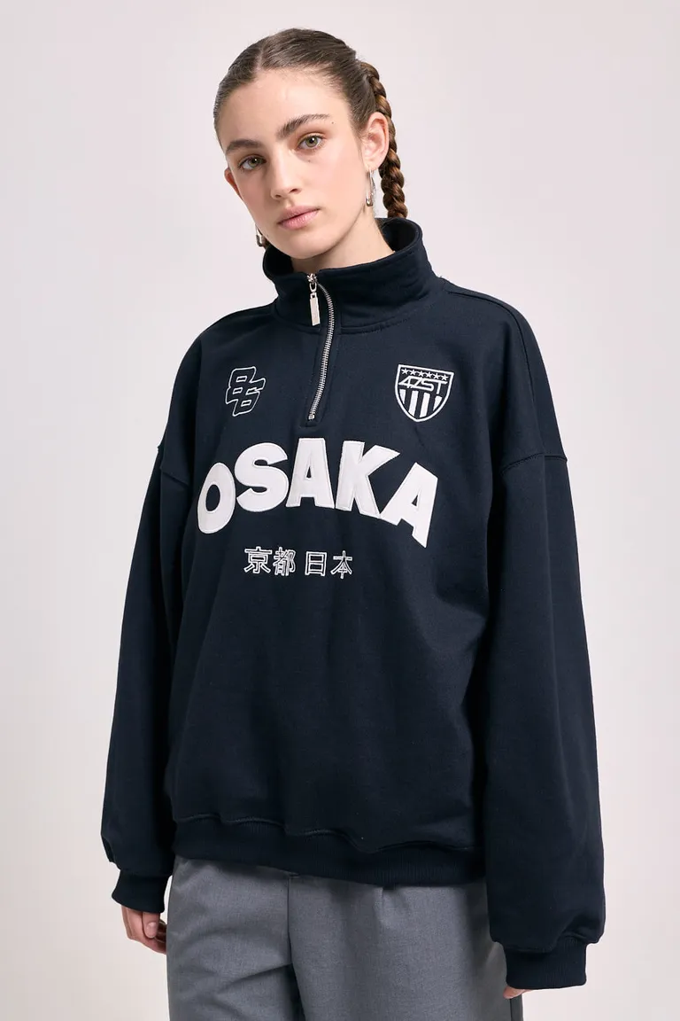 Buzo con cuello alto y medio cierre frontal, diseñado con un calce holgado y relajado. Presenta estampas gráficas frontales con detalles inspirados en Osaka. Ideal para combinar en outfits urbanos, ofreciendo comodidad y un estilo versátil para usar a diario. Su diseño atemporal permite múltiples combinaciones con diferentes prendas inferiores.