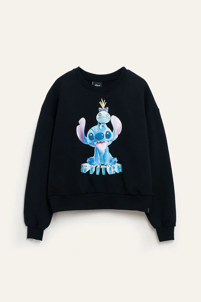 Buzo de manga larga con cuello redondo, puños y cintura ajustados en ribb. Presenta una estampa frontal con el personaje de Stitch, ideal para combinar en looks informales. Una prenda versátil, cómoda y con diseño exclusivo de licencia oficial Disney, perfecta para sumar estilo a tus conjuntos diarios durante el otoño e invierno.