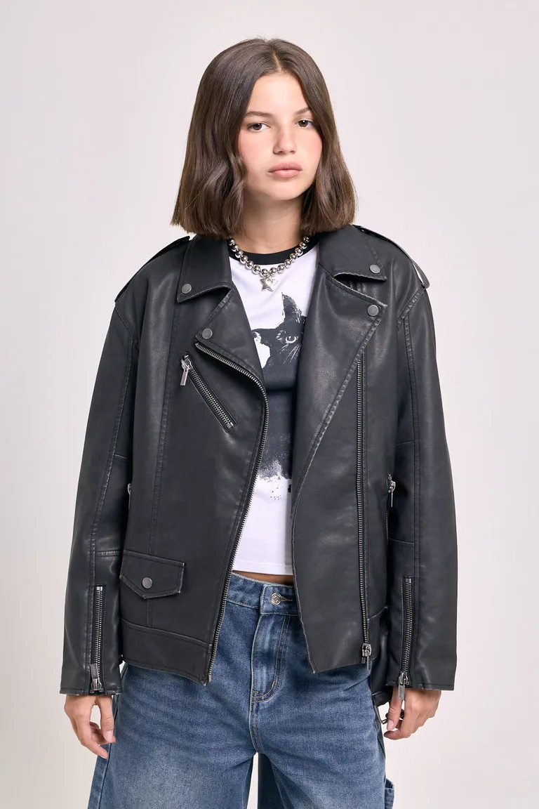 Campera tipo biker con acabado efecto cuero, cierre metálico frontal y detalles metálicos en bolsillos y puños. Incluye cinturón regulable en cintura, charreteras en hombros y bolsillo delantero con tapa, ofreciendo un estilo urbano y moderno con calce holgado ideal para combinar en capas.