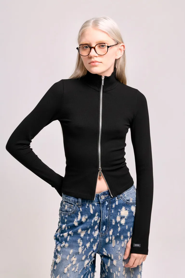 Campera de calce adherente con cuello alto que estiliza la figura. Presenta un cierre metálico de doble deslizador que permite versatilidad al usarla, junto con aberturas para los pulgares en los puños. Una prenda funcional de diseño minimalista, ideal para complementar diversos outfits o como capa base en capas, aportando comodidad y un toque moderno a cualquier look cotidiano.