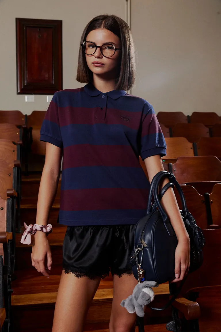 Chomba de manga corta con diseño a rayas horizontales y cuello clásico con cierre de botones. Presenta un bordado distintivo en la zona del pecho, ofreciendo un estilo versátil y cómodo para el uso diario. Ideal para combinar en conjuntos urbanos tanto con prendas informales como con opciones más arregladas.