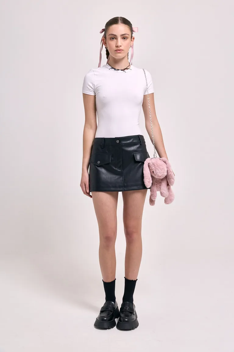 Falda corta con diseño de tiro medio, cintura con presillas para cinturón y cierre metálico frontal. Incorpora tapas de bolsillos decorativas en la parte delantera que aportan detalle al diseño. Un modelo versátil para combinar en looks casuales o urbanos, caracterizado por su corte estructurado y funcionalidad.