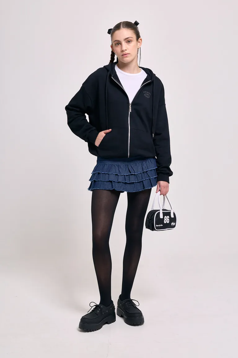 Falda de denim con diseño de tres volados superpuestos con terminación desflecada y canesú. Esta prenda cuenta con un short interno integrado para mayor comodidad y practicidad, cierre lateral y detalle de etiqueta marcaria que suma identidad. Una opción versátil y fresca para complementar looks urbanos y casuales durante todo el año.