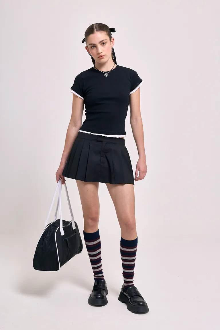 Falda mini de estilo sastrero con tablas frontales y diseño de tiro bajo. Incluye short interno para mayor comodidad y detalles de bolsillos ojal simulados. Una prenda versátil para combinar en conjuntos urbanos con un toque sofisticado y moderno.
