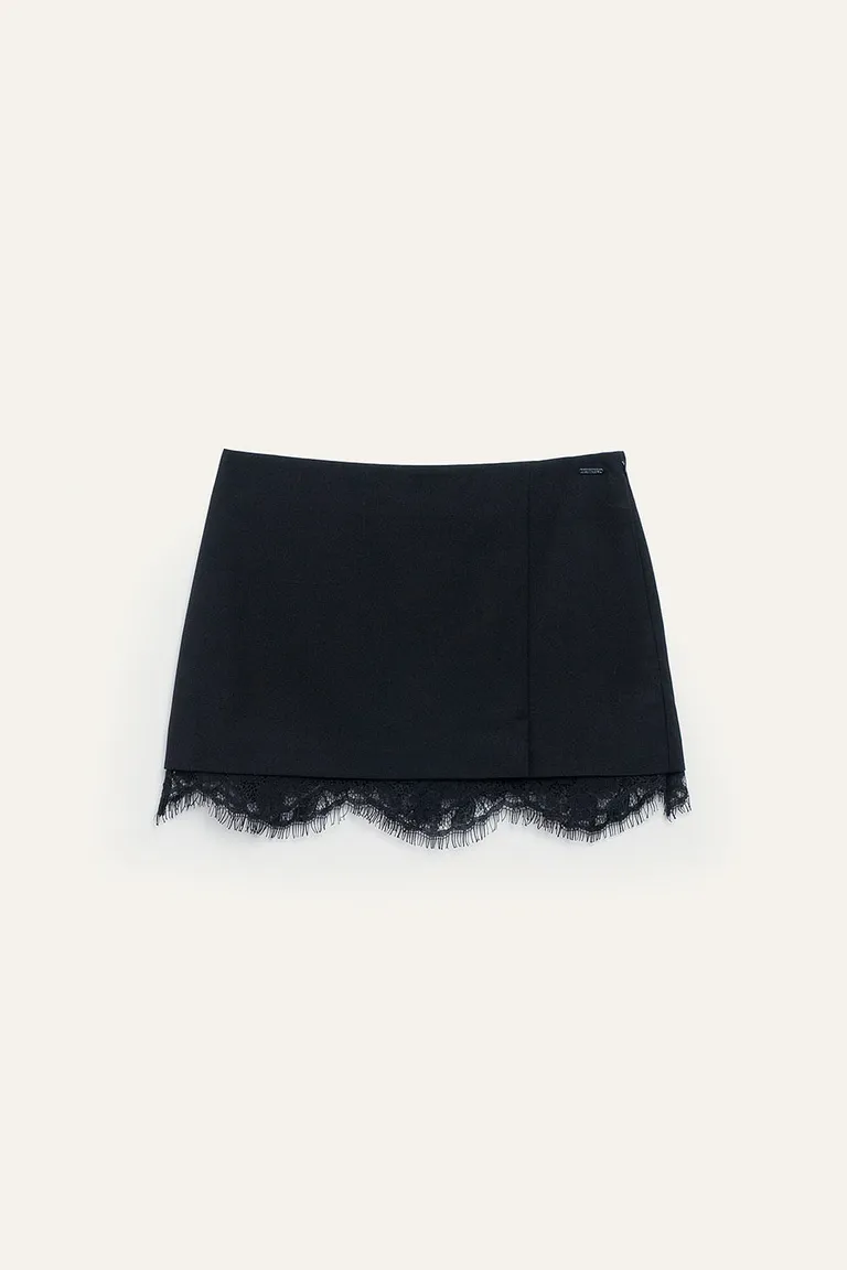 Falda mini de estilo sastrero con tiro medio y terminación en puntilla. Esta prenda presenta una estética refinada con un cierre lateral invisible, ideal para crear diversos conjuntos. Es una opción versátil para incorporar al guardarropa diario o para eventos más formales, combinando diseño clásico con un detalle moderno en el ruedo.