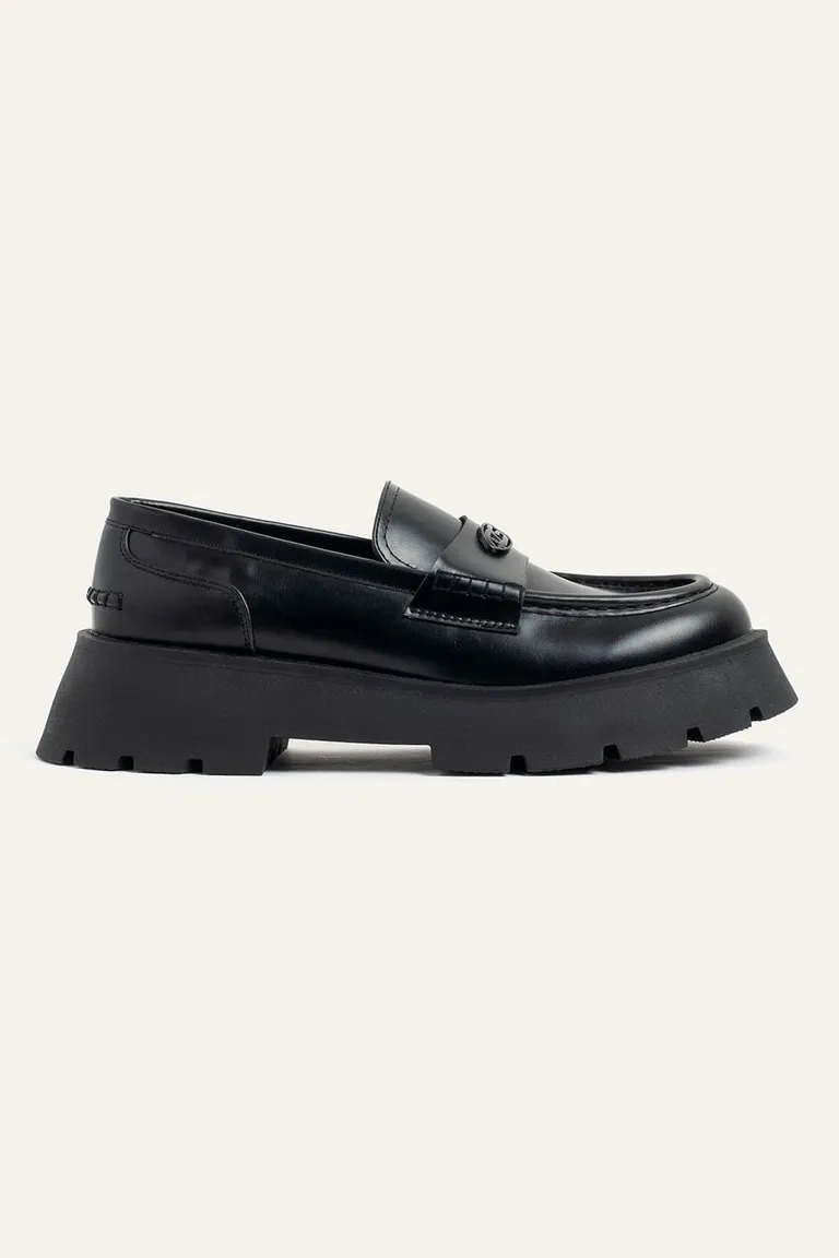 Mocasines de diseño clásico con terminación pulida y detalle metálico en el frente. Cuentan con una base robusta de plataforma que aporta estabilidad y volumen, manteniendo una estética versátil que se adapta tanto a outfits formales como a conjuntos urbanos cotidianos.