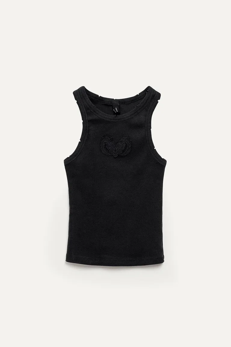 Musculosa de estilo halter con detalle de bordado al tono en el frente. Presenta un diseño ajustado con terminaciones desgastadas, ideal para combinar en looks casuales y urbanos. Una pieza versátil para integrar en cualquier equipo diario que destaca por su silueta definida y su estética sencilla.