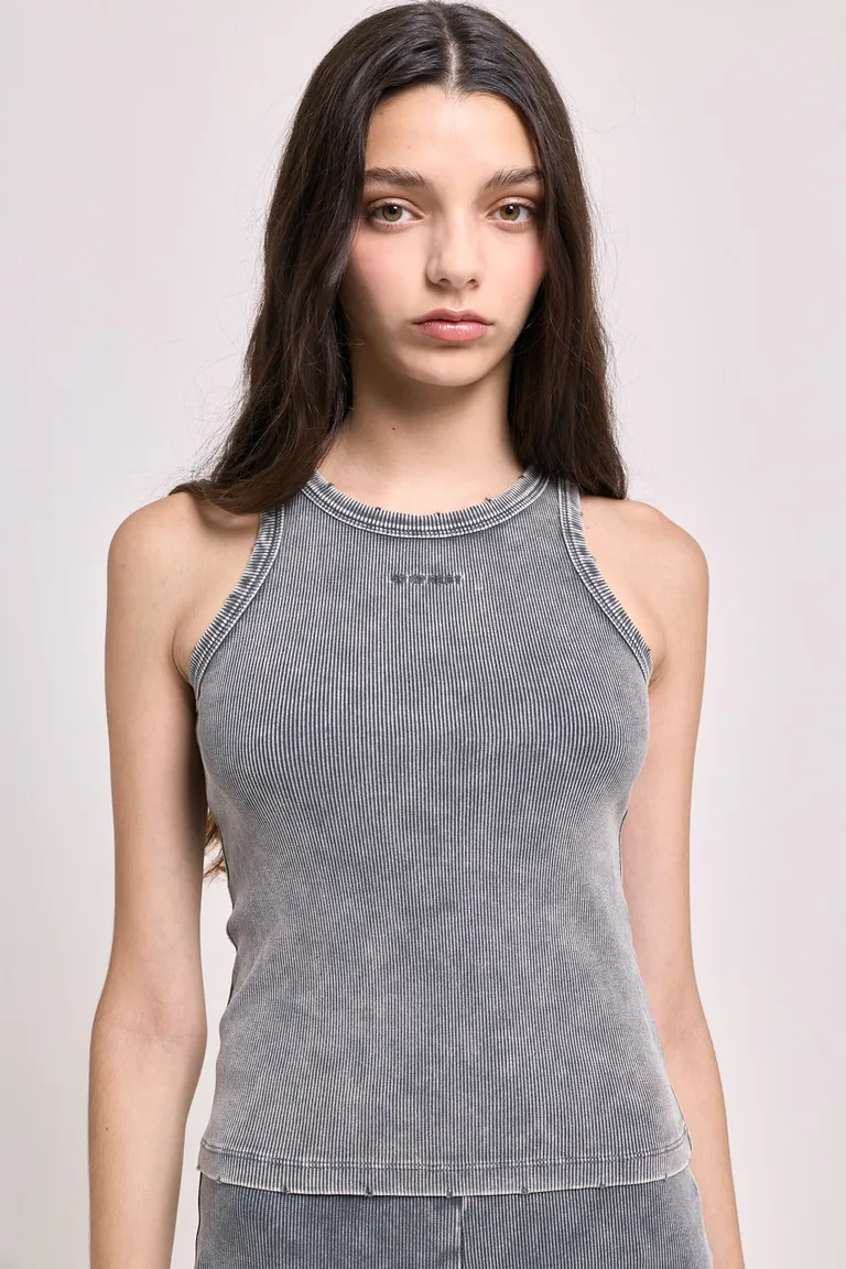 Musculosa de calce adherente con cuello redondo y diseño en textura de morley. Presenta un efecto gastado que le aporta un aspecto relajado y un pequeño bordado en el frente. Una prenda versátil para combinar en cualquier ocasión, ideal para un estilo urbano y casual.