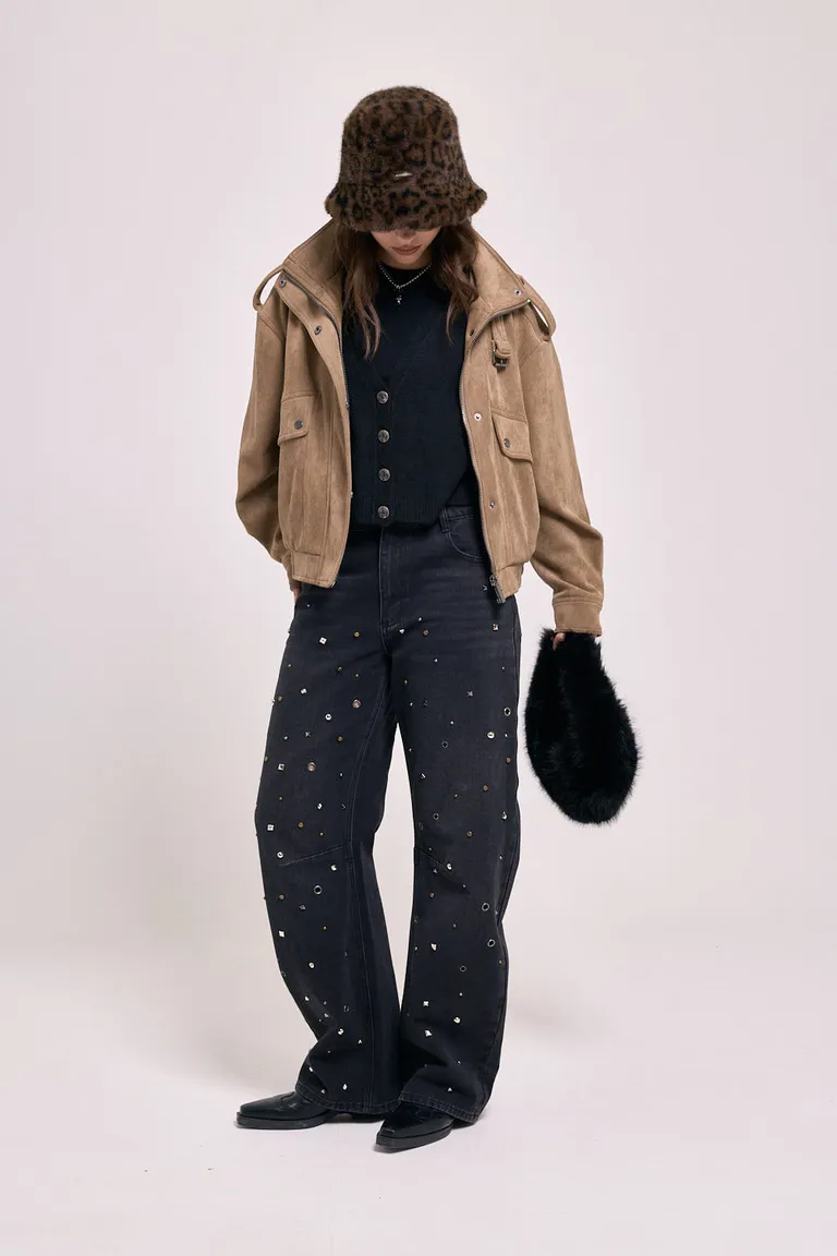Pantalón de corte holgado con diseño de tiro alto y pierna relajada. Presenta una textura lisa con múltiples apliques brillantes distribuidos por toda la prenda, ideal para quienes buscan un estilo urbano con un toque distintivo. Cuenta con estructura de cinco bolsillos y cierre frontal, ofreciendo una opción versátil para armar equipos informales o más sofisticados según la ocasión.