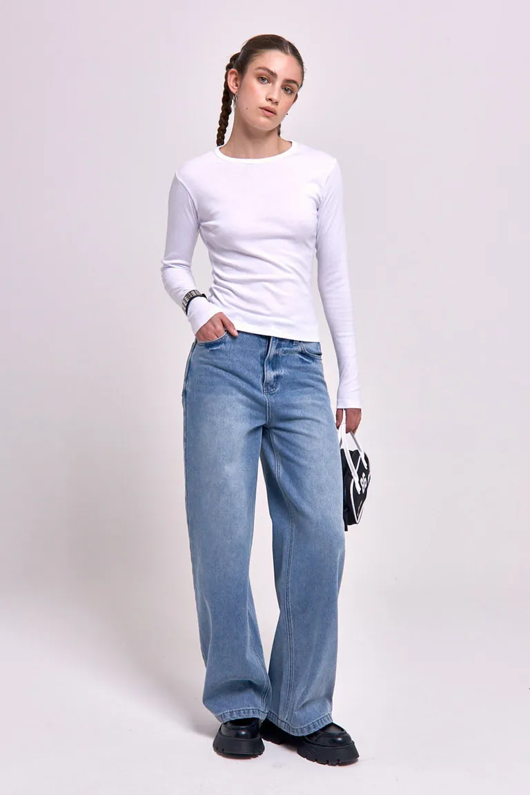 Jean de corte wide leg con diseño de piernas amplias y tiro medio. Presenta un calce relajado y cómodo, ideal para crear diferentes looks casuales. Su diseño atemporal permite versatilidad en el uso diario, combinando con diversas prendas para un estilo urbano y actual.