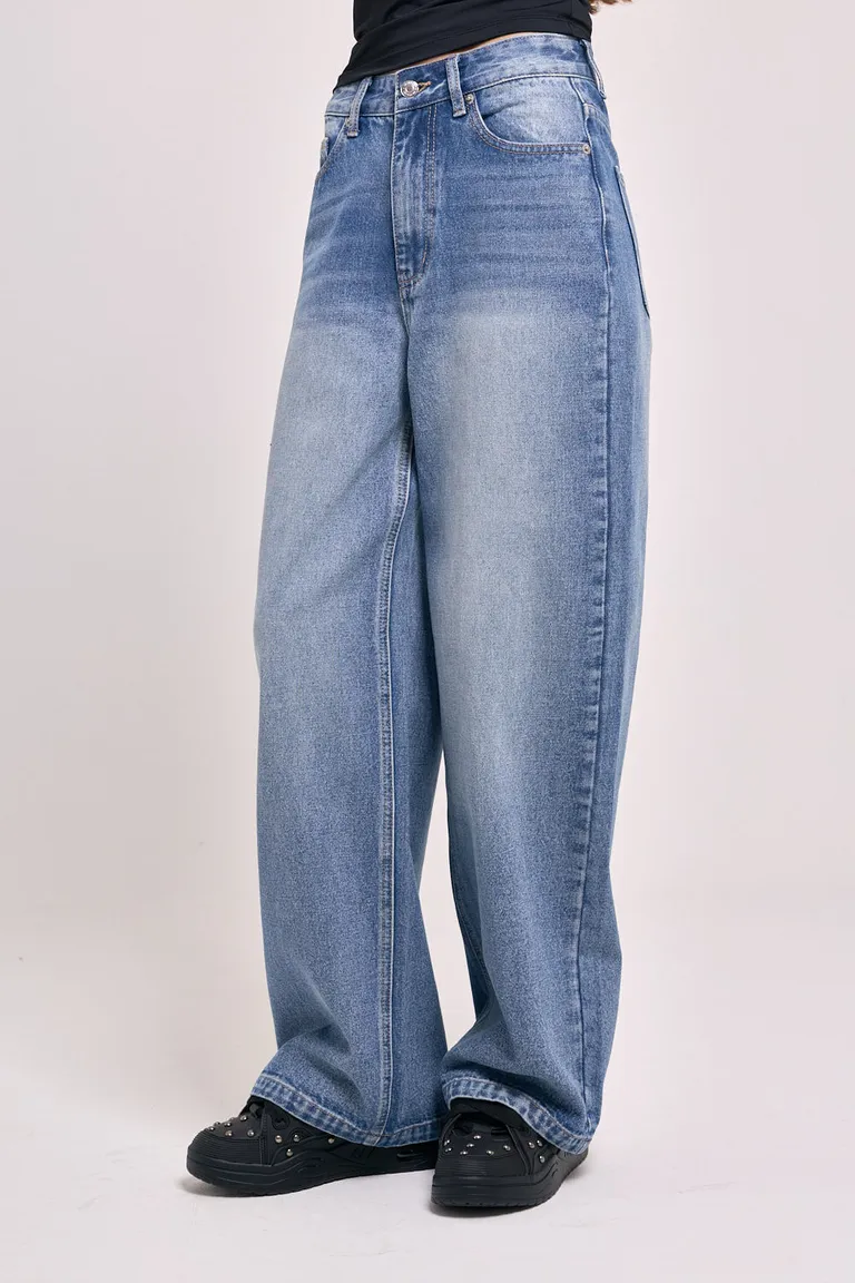 Pantalón de jean con diseño de pernera ancha y tiro medio. Presenta un lavado con efecto desgastado y costuras reforzadas que definen su silueta amplia. Un básico versátil para incorporar en looks urbanos y relajados, manteniendo un calce cómodo y holgado en toda la pierna. Ideal para combinar con diversas prendas superiores y calzado casual.