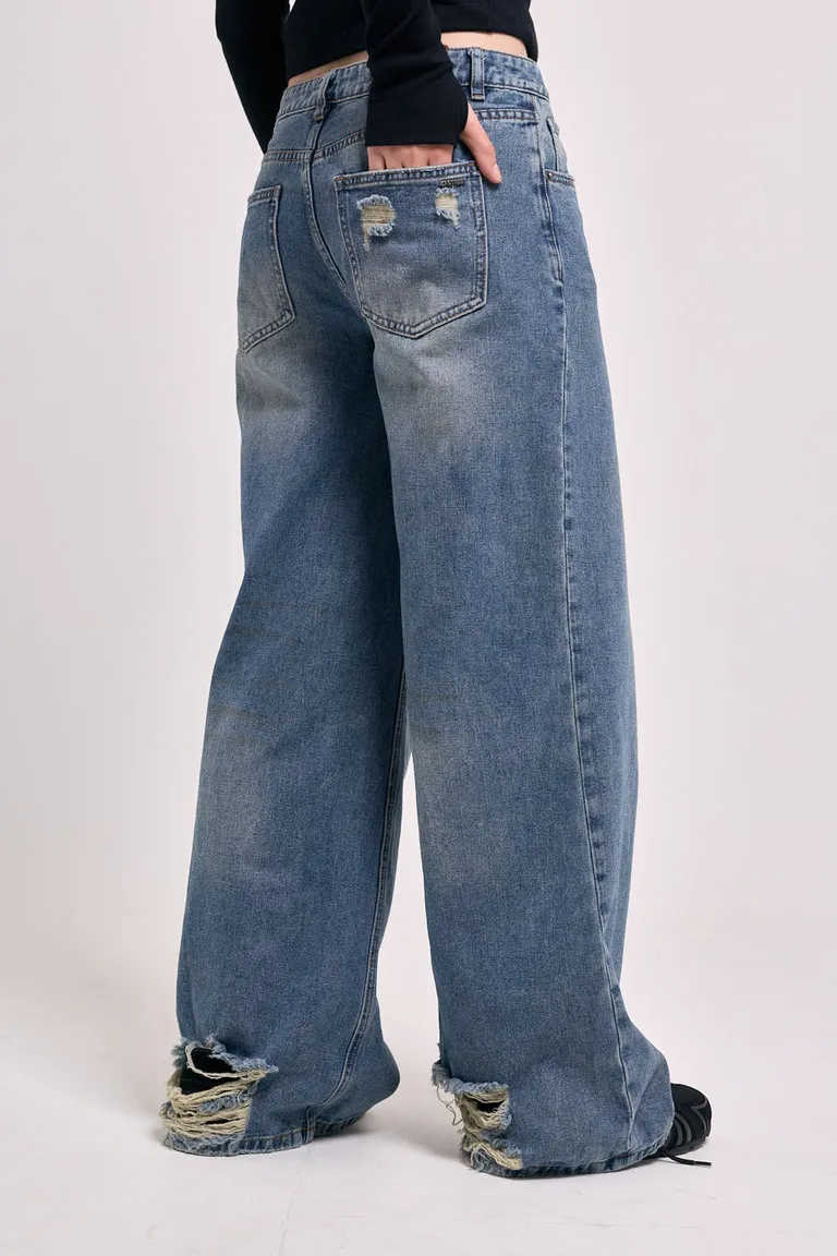 Pantalón de jean con diseño wide leg y detalle de tiro medio. Presenta un estilo relajado con terminaciones desgastadas en los bajos y bolsillos traseros intervenidos, ofreciendo una estética urbana y actual para el uso diario. El diseño cuenta con un calce cómodo y versátil que complementa diversos conjuntos, ideal para quienes buscan una prenda atemporal con detalles distintivos.