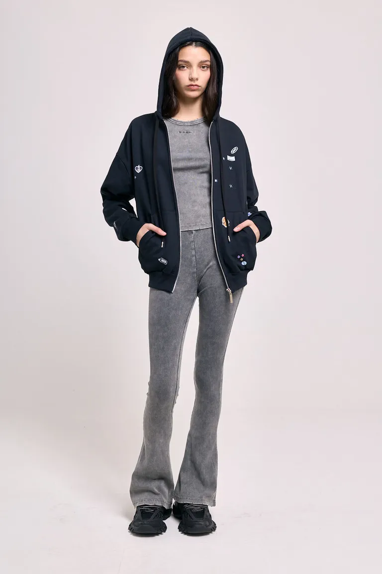 Pantalón con diseño de tiro medio y corte acampanado, que presenta un acabado con efecto gastado. Con cintura elástica para un mejor calce y detalles bordados, esta prenda ofrece un estilo urbano y versátil. Su calce al cuerpo y textura sutil lo convierten en una opción cómoda para usar en el día a día, combinándose fácilmente con distintas prendas superiores.
