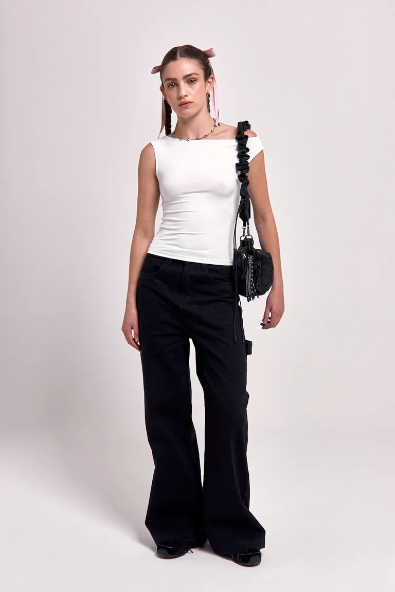 Pantalón de estilo carpenter con diseño de cinco bolsillos. Presenta un tiro medio y un calce relajado con pierna amplia, ideal para quienes buscan comodidad y un look urbano en su día a día. Cuenta con detalles de herrajes en tono oscuro y logo en relieve, manteniendo una estética limpia y versátil.