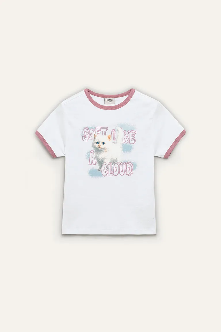 Remera de corte clásico con cuello redondo y detalles en los bordes. Presenta un estampado frontal centrado de un gatito con leyenda, ideal para sumar un toque distintivo a tus outfits diarios. Su diseño versátil permite múltiples combinaciones con pantalones o faldas de tiro alto.
