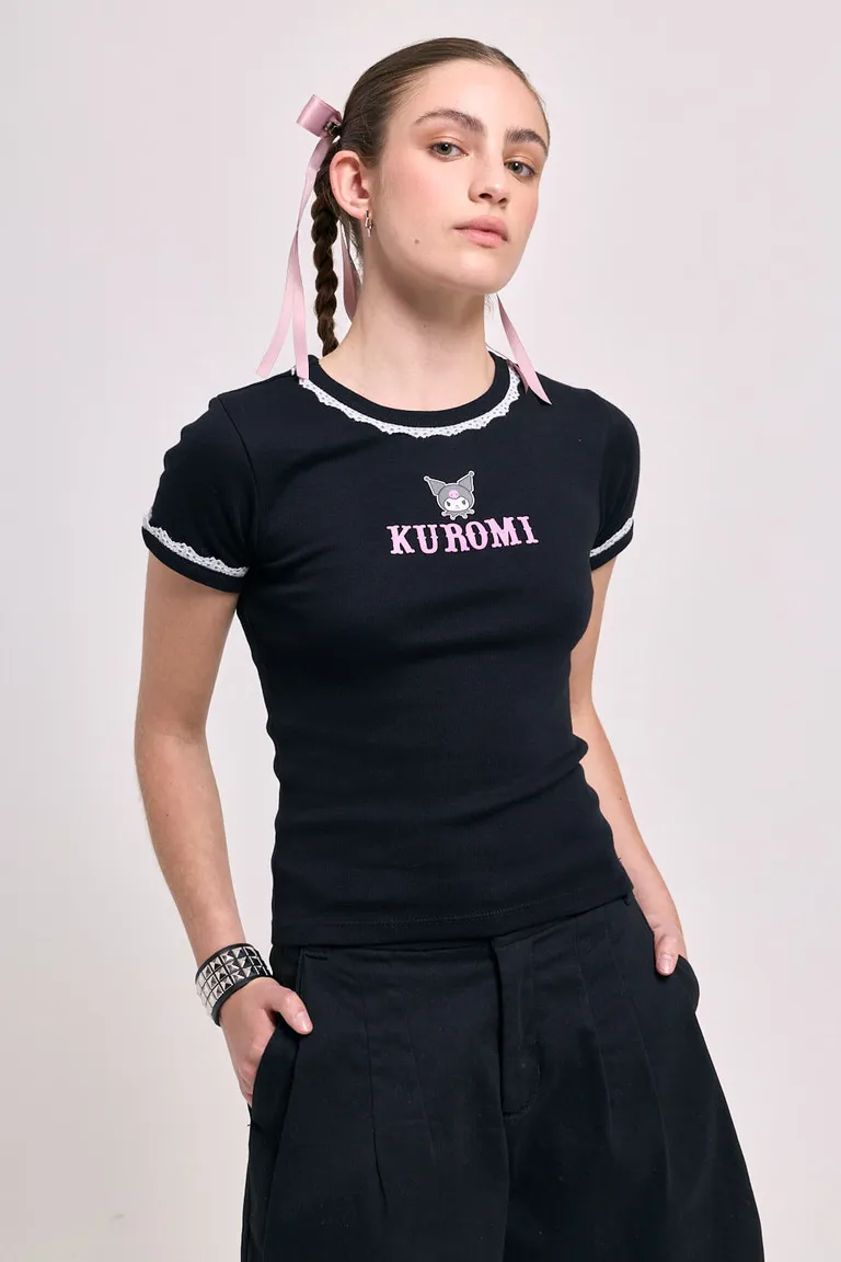 Remera de manga corta con corte al cuerpo, escote redondo y detalle de puntilla en el cuello y las terminaciones de las mangas. Presenta una estampa frontal temática de Kuromi. Es una prenda versátil de estilo urbano para sumar a tu guardarropa cotidiano.