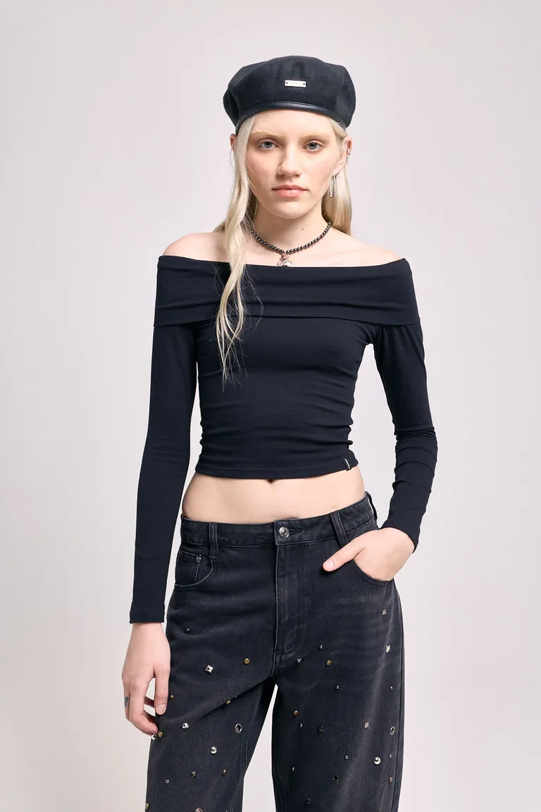 Remera de manga larga con ajuste al cuerpo y diseño de escote descubierto que sigue la línea de los hombros. Una prenda versátil, de líneas simples y calce entallado, diseñada para integrarse fácilmente en diversos conjuntos diarios. Su diseño minimalista permite múltiples combinaciones con prendas de tiro alto o como base de outfits superpuestos.