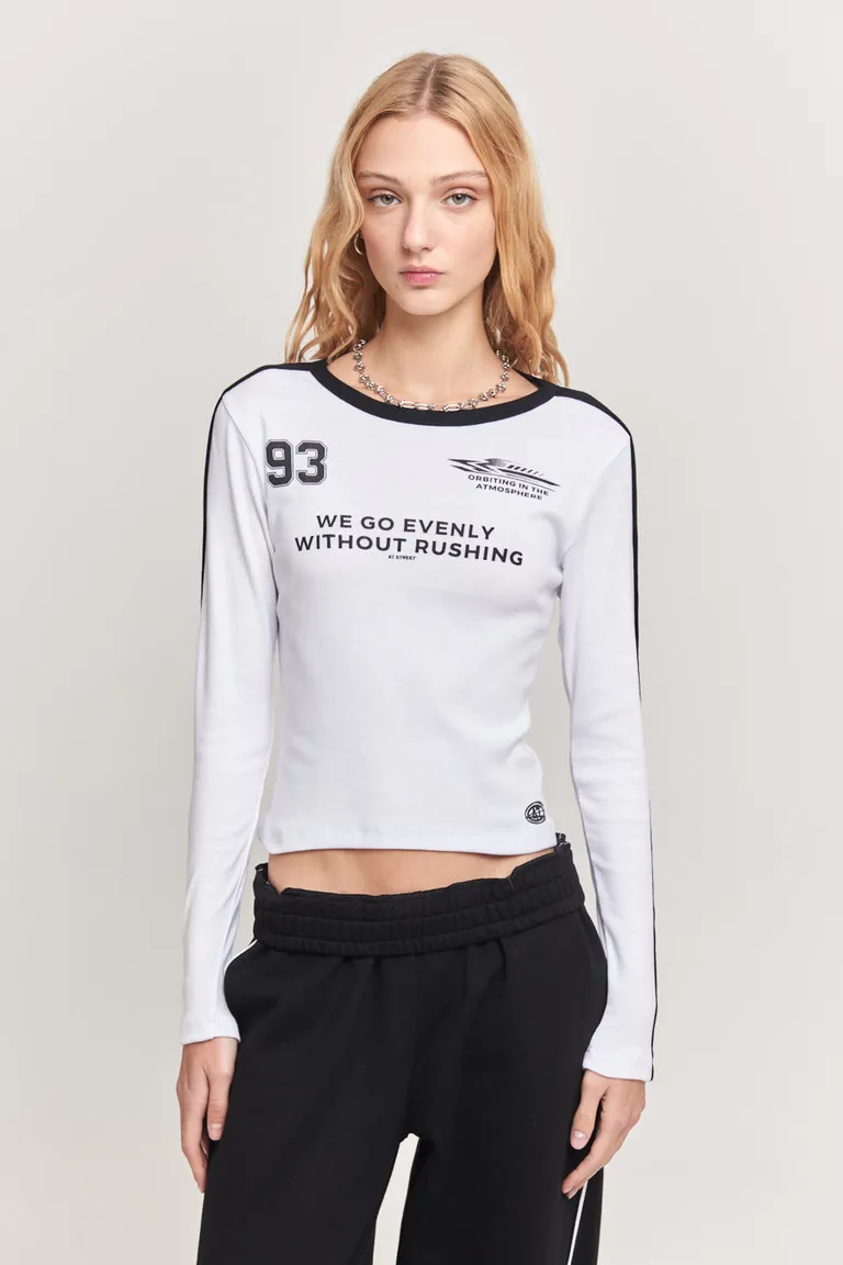 Remera de manga larga con diseño entallado, cuello redondo y detalles estampados en el frente. Una prenda versátil de largo a la cadera que se adapta a diversos estilos casuales y urbanos, brindando comodidad para el uso diario.