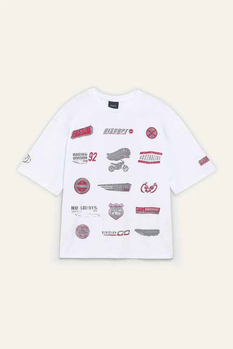 Remerón de diseño urbano con calce holgado tipo boxy y mangas cortas. Presenta múltiples estampas gráficas distribuidas en el frente y mangas que le otorgan un estilo distintivo. Una prenda versátil ideal para complementar outfits cotidianos y relajados durante toda la temporada.