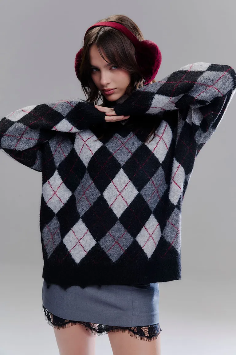Sweater con diseño de rombos y detalle de terminaciones desgastadas. Presenta un escote en V y un calce holgado que brinda comodidad y versatilidad para combinar en diferentes outfits. Ideal para usar en capas sobre camisas o solo, logrando un estilo urbano y actual.