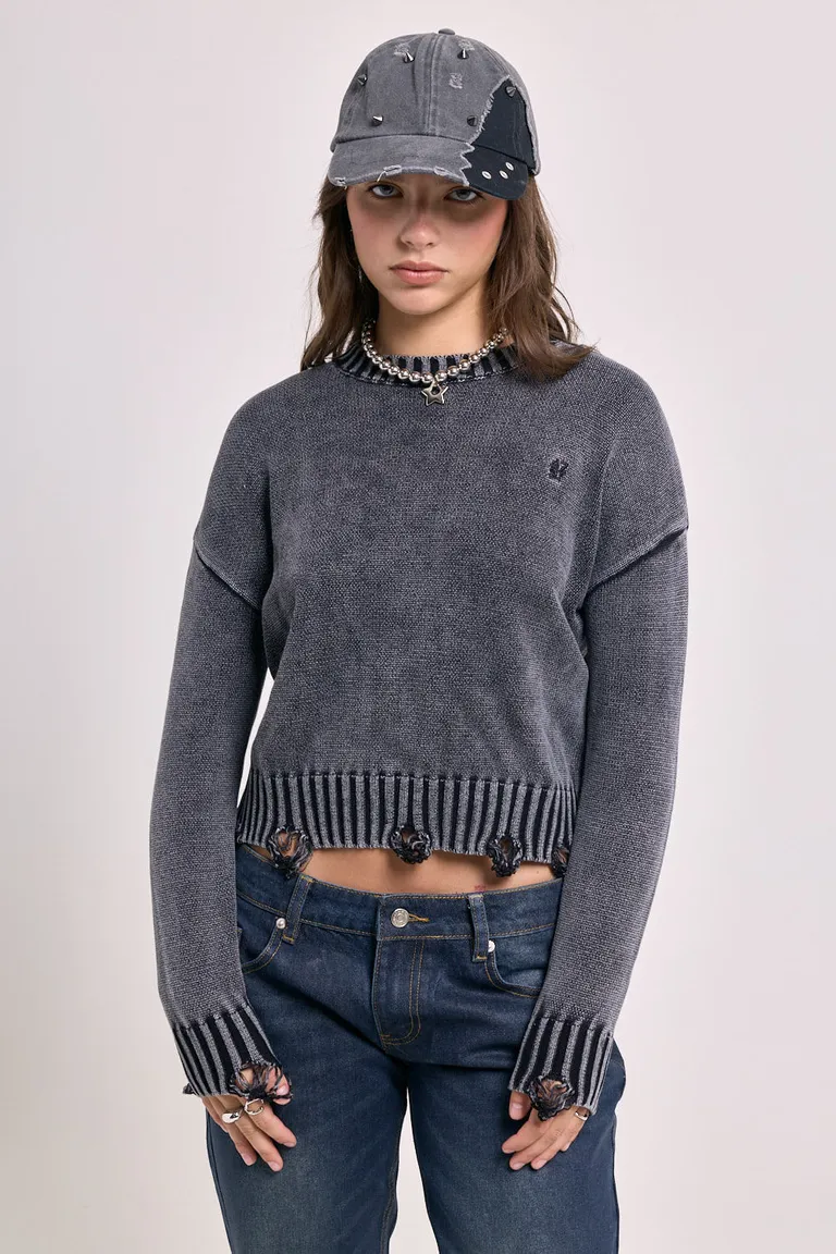 Sweater con diseño de efecto lavado, cuello redondo y calce holgado que brinda un estilo relajado. Presenta detalles de terminaciones desgarradas en puños y cintura, proporcionando un aspecto distintivo y moderno para el uso diario. Una prenda versátil y cómoda ideal para completar diversas combinaciones en la temporada.