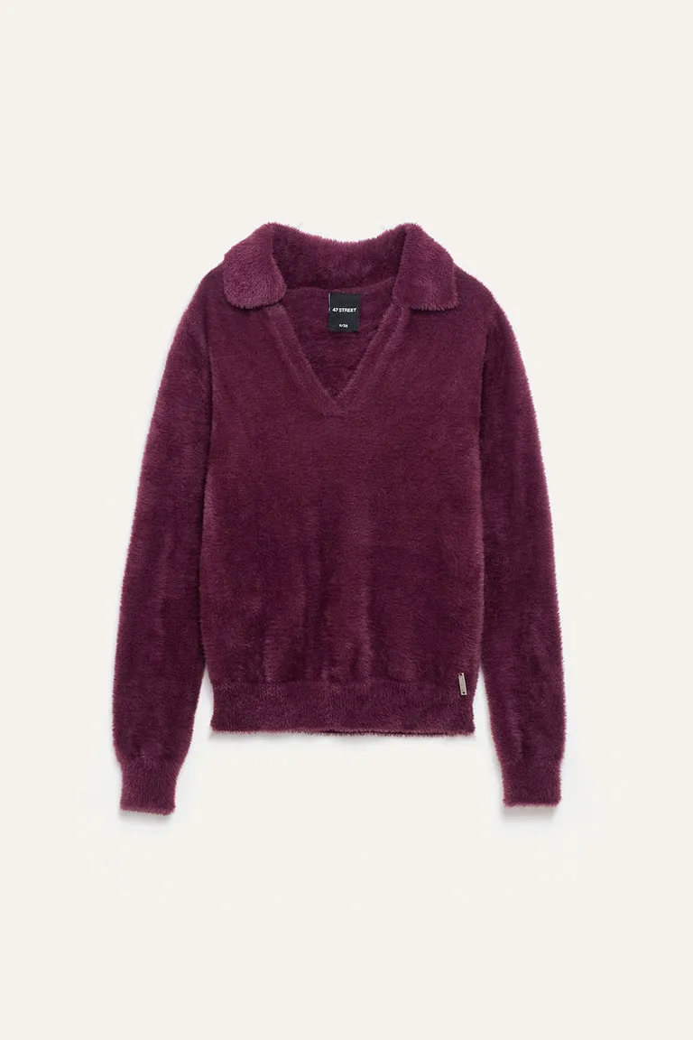Sweater de textura suave con cuello polo y diseño de escote en V. Presenta puños y ruedo elastizados que brindan un ajuste cómodo. Una prenda versátil ideal para integrar en outfits casuales o informales, perfecta para combinar con diversas prendas inferiores gracias a su diseño de calce semi adherente.