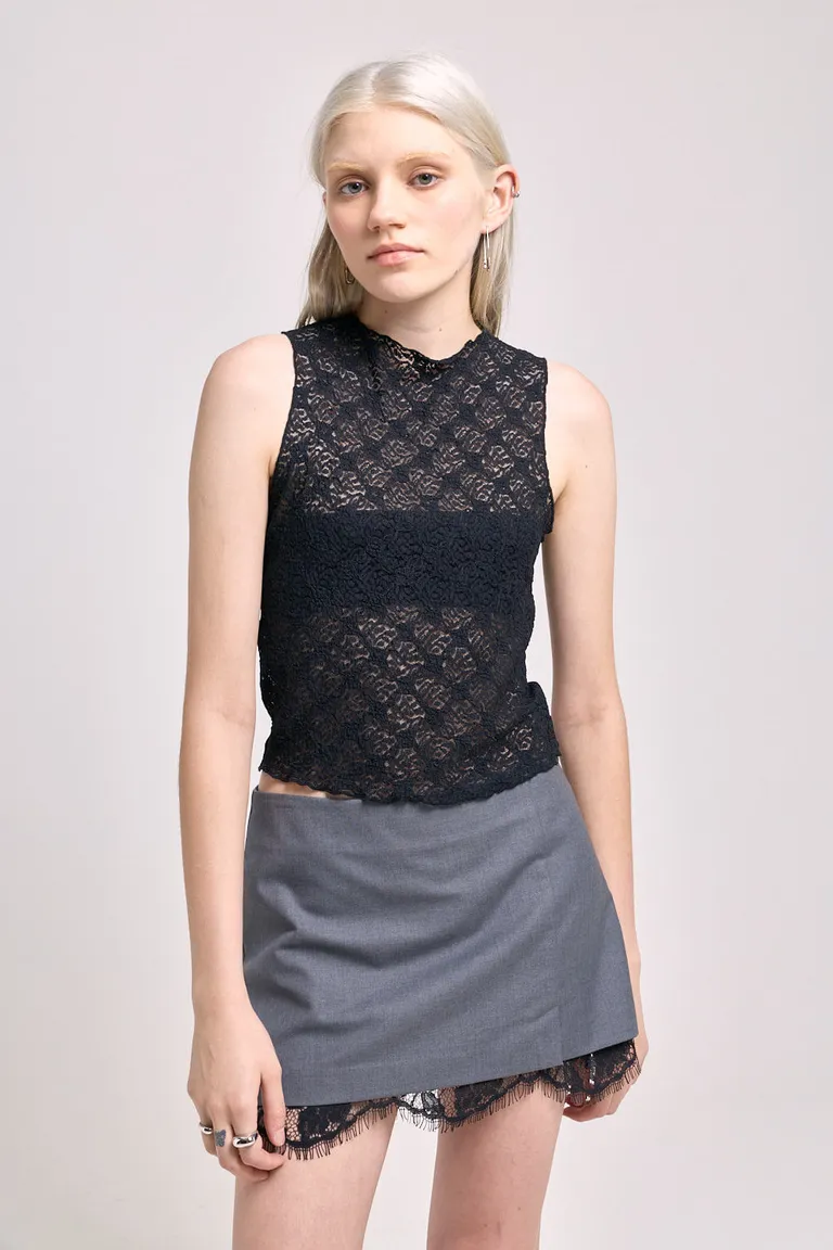 Top de encaje blanco con cuello alto y detalles elegantes de 47 Street