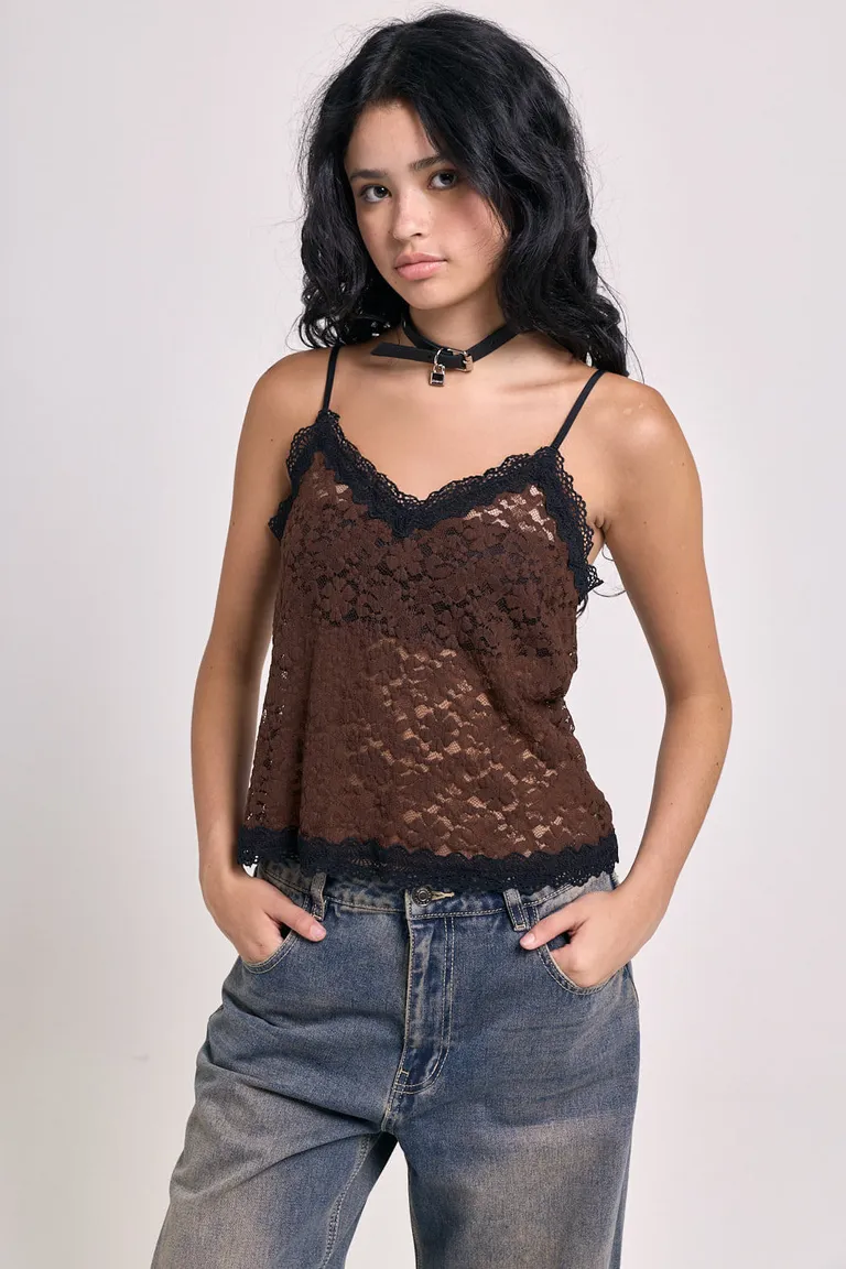 Top con diseño de encaje que incluye tiras regulables y delicados detalles de puntilla tanto en el escote como en el ruedo. Esta prenda se destaca por su textura y versatilidad para crear diversos conjuntos. Ideal para usar en distintas ocasiones, ofreciendo un ajuste cómodo y un estilo definido que se adapta a diferentes elecciones de vestuario.