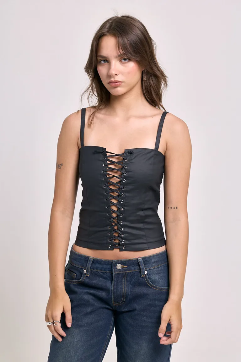 Top tipo corset con diseño entallado y ajuste frontal mediante cordones. Esta prenda destaca por sus breteles finos y cierre lateral, ofreciendo un estilo estructurado y moderno que se adapta al cuerpo para elevar cualquier look diario. Una pieza versátil y distinguida para combinar en diversas ocasiones.
