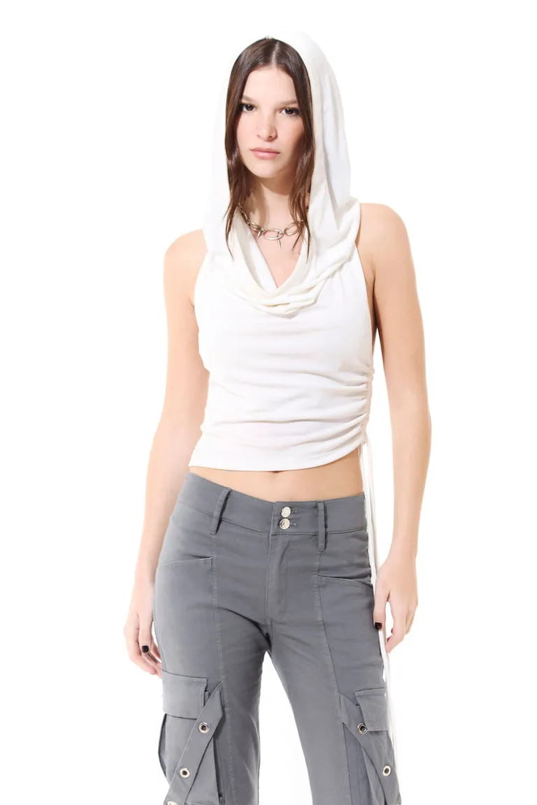 Top sin mangas que incorpora una capucha y cuello estilo abuchonado. Presenta un ajuste lateral mediante una tira regulable, permitiendo modificar el largo de la prenda según la preferencia de uso. Su diseño sin mangas y el corte favorecedor lo convierten en una opción versátil para diversos conjuntos diarios.