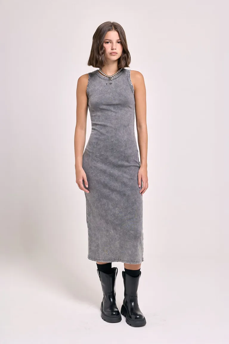 Vestido largo de corte ajustado y silueta ceñida, ideal para quienes buscan una prenda versátil. Con detalle de tajo en la espalda que facilita el movimiento y bordado exclusivo que le otorga un sello distintivo. Presenta un efecto de lavado desgastado que aporta un estilo urbano y actual, perfecto para usar tanto de día como de noche.