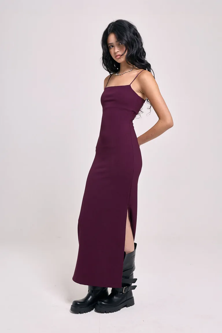 Vestido largo al cuerpo con breteles finos y tajo lateral en el ruedo de 47 Street