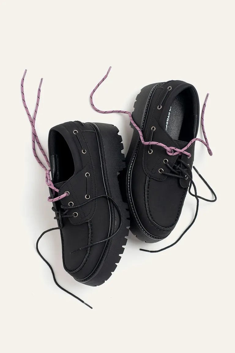 Zapato tipo náutico de estilo urbano con base de plataforma. Presenta un diseño de ajuste por cordones con detalles de ojales metálicos, ofreciendo una estética moderna y funcional. Incluye cordones intercambiables para mayor versatilidad en tus combinaciones diarias.