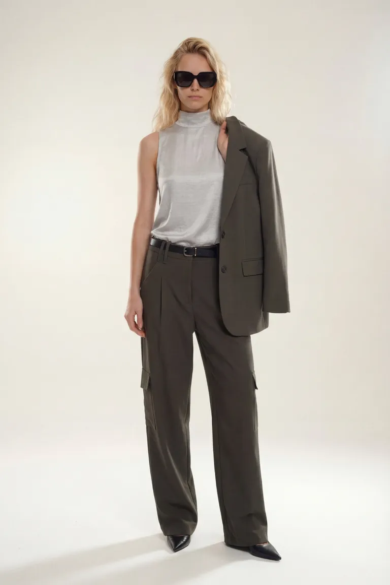 Body de mujer con cuello alto, diseño sin mangas, corte al cuerpo y cierre a presión en la base. Una prenda versátil ideal para crear capas o usar como pieza principal en looks urbanos y modernos. Presenta un estilo minimalista que se adapta a diversas ocasiones con elegancia.