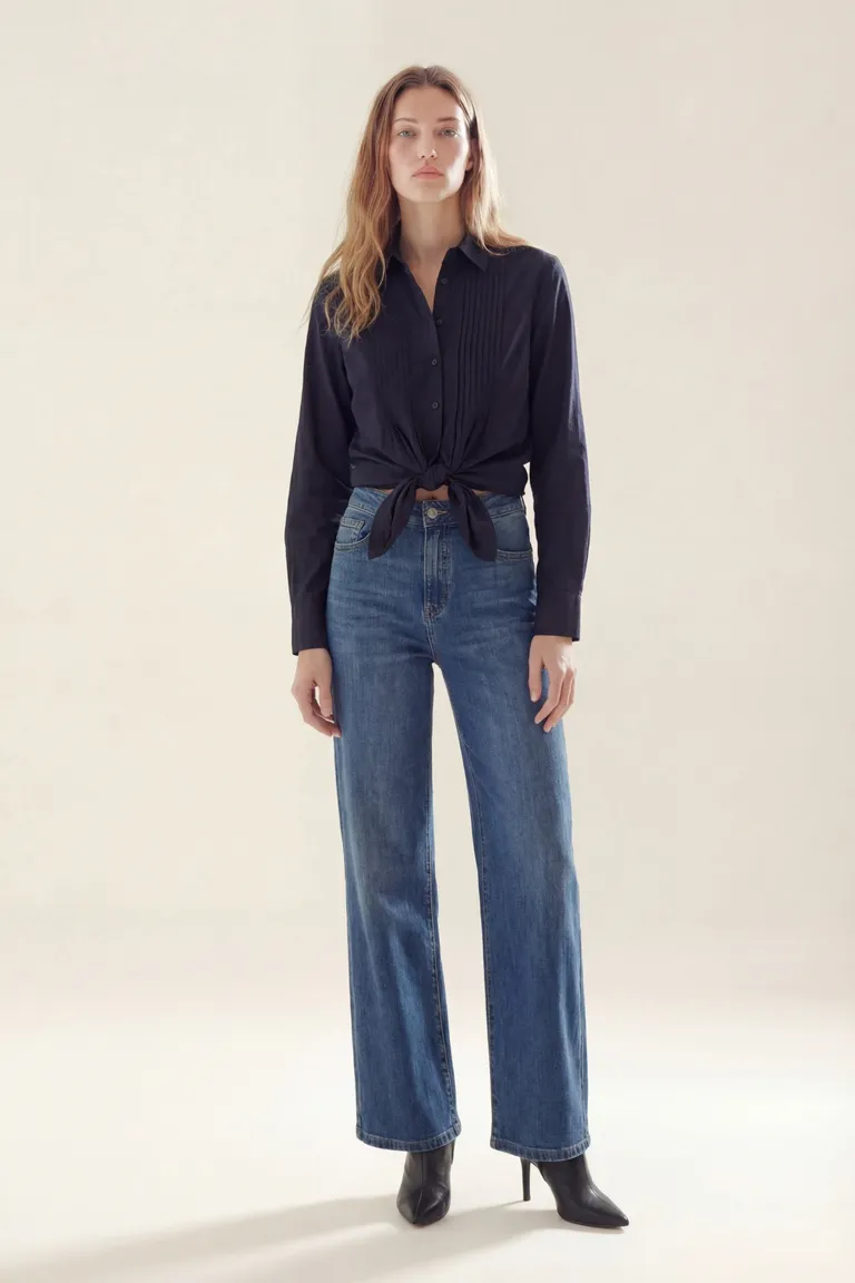 Camisa de manga larga con detalle de alforzas verticales en el frente y cierre frontal mediante botones. Presenta un diseño versátil con opción de anudado en la cintura, ideal para lograr un look relajado y estructurado a la vez. Una prenda básica y funcional que se adapta a diferentes ocasiones, aportando un estilo refinado al guardarropa femenino.