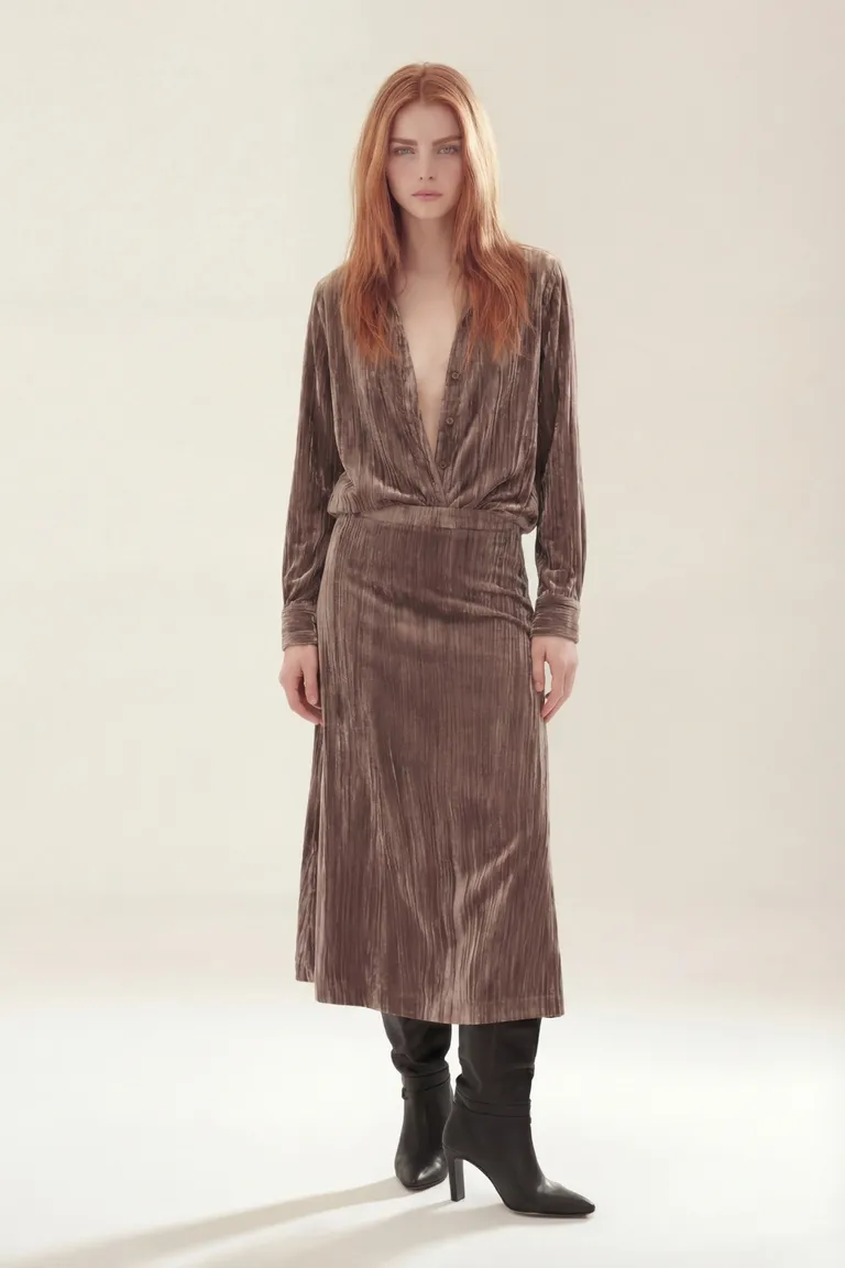 Camisa de mujer con cuello en v profundo y mangas largas, presenta una textura plisada que aporta movimiento y elegancia. El corte relajado se adapta a diversas ocasiones, ideal para combinar con diferentes prendas. Disponible en talles seleccionados para un calce cómodo y versátil.