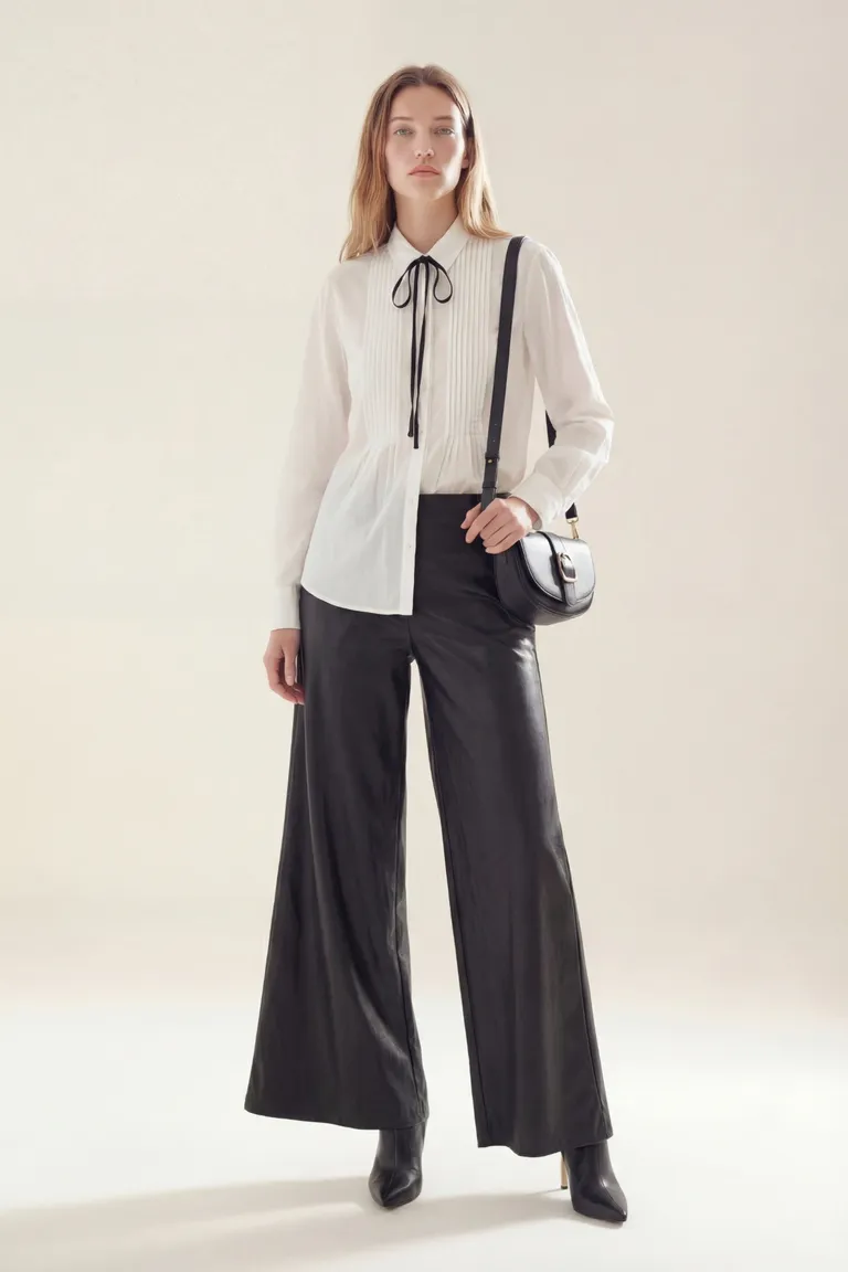 Camisa de corte clásico con cuello tradicional y detalle de tablas verticales en el frente. Presenta un lazo fino para anudar en la parte superior y mangas largas con puños estructurados. Diseño versátil ideal para combinar en looks formales o casuales, ofreciendo una silueta limpia y sofisticada.
