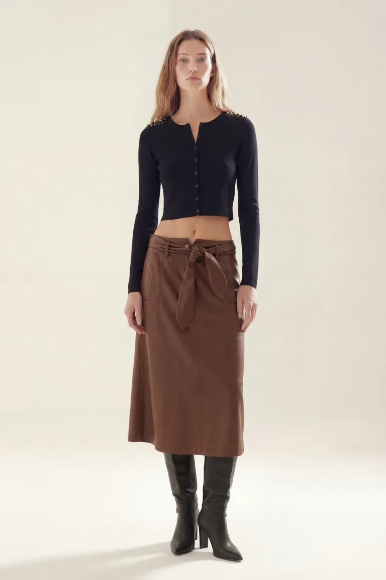 Cardigan de corte cropped con abotonadura frontal y detalle de apliques decorativos en los hombros. Esta prenda presenta mangas largas y un ajuste entallado, ideal para combinar con diversas opciones de la temporada. Su diseño versátil permite un uso cotidiano o en ocasiones especiales, brindando una estética moderna y funcional para el guardarropas.