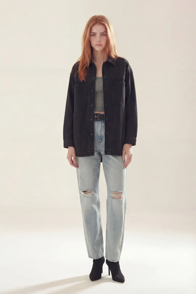 Chaqueta de corte clásico y diseño funcional con cierre frontal de botones. Ideal para completar outfits casuales y urbanos, brindando un abrigo ligero y versátil para el día a día. Presenta un estilo atemporal con cuello camisero y bolsillos frontales, perfecta para combinar con diversas prendas.