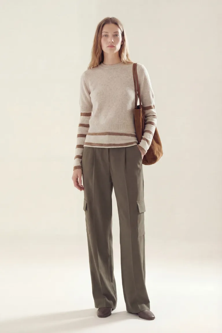 Pantalon de corte recto tipo cargo con bolsillos laterales definidos y tiro medio. Una prenda versatil con pinzas frontales que brinda un calce holgado y elegante para el uso diario en diversas ocasiones.