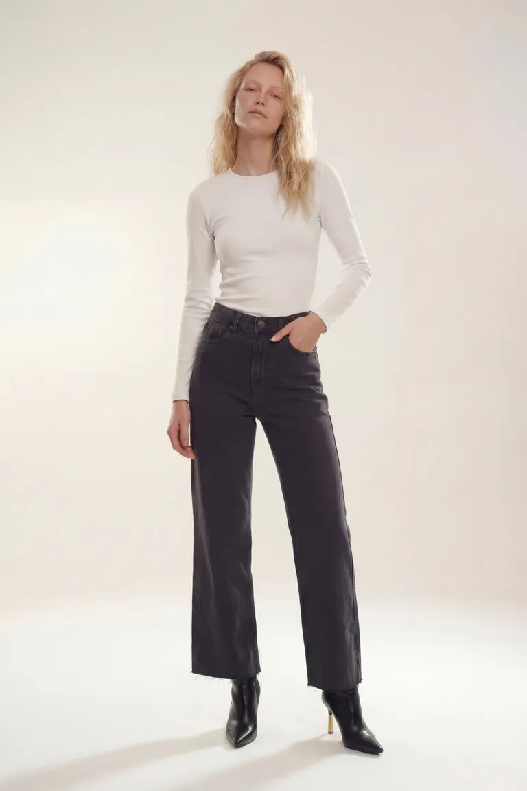 Pantalón de corte wide leg con diseño de tiro medio y botamanga recta. Presenta un estilo clásico con bolsillos laterales y traseros, ideal para completar equipos urbanos versátiles. Su calce favorece la figura gracias a su estructura relajada en las piernas.