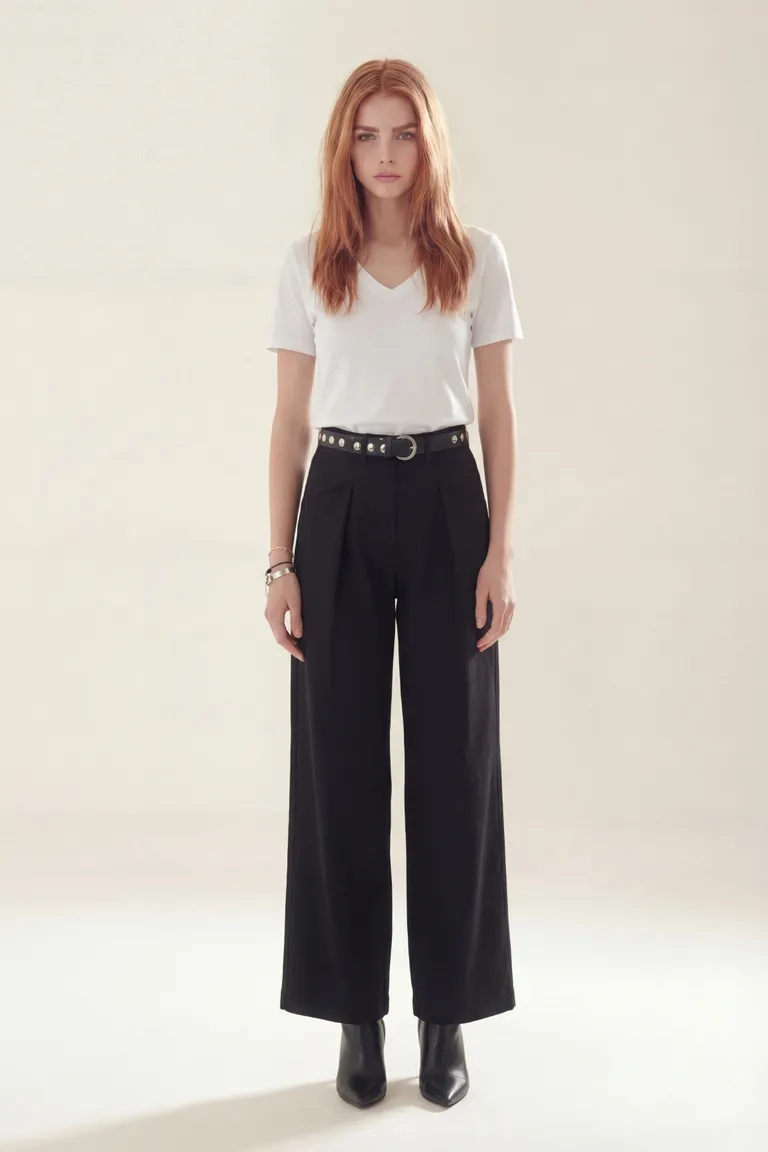 Pantalón de corte amplio y tiro alto con diseño estructurado. Presenta una caída recta y elegante, ideal para un look formal o casual. Incluye pinzas frontales que aportan un calce favorecedor, combinando comodidad y estilo en una prenda versátil para el día a día.
