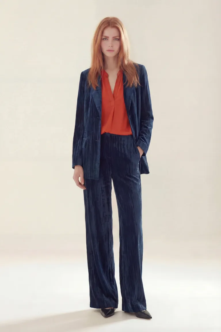 Pantalón de corte sastrero con piernas holgadas y tiro medio. Presenta una textura sutil que aporta movimiento y elegancia. Ideal para complementar equipos de oficina o eventos nocturnos gracias a su versatilidad y diseño fluido. Se ajusta cómodamente a la cintura ofreciendo una silueta estilizada y moderna. Disponible en varios talles.
