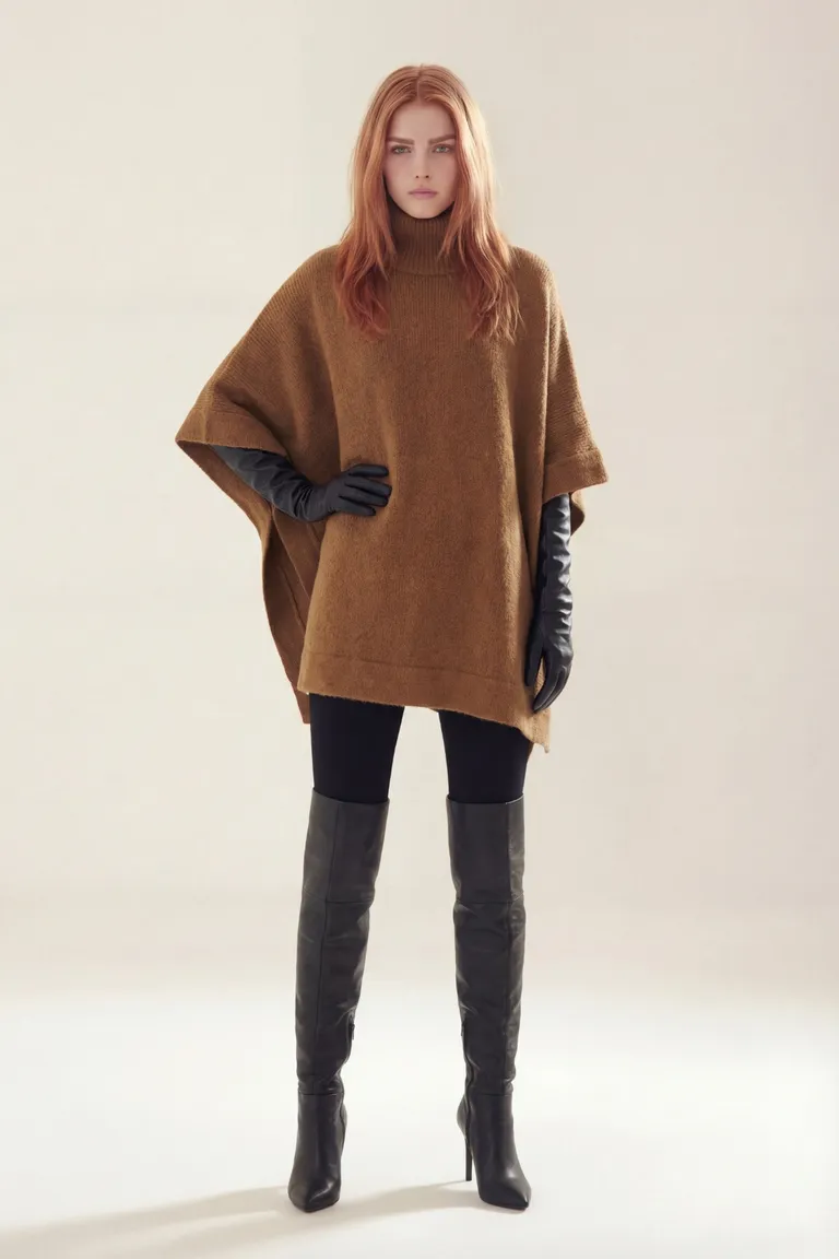 Poncho con cuello alto diseñado para brindar abrigo y estilo en los días fríos. Su corte amplio y versátil permite combinarlo fácilmente con diferentes prendas de invierno, aportando una silueta elegante y sofisticada para completar cualquier conjunto de temporada.