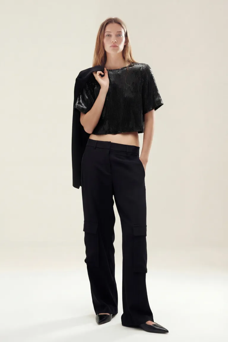 Remera de corte corto con mangas cortas, ideal para un estilo moderno y versátil. Presenta una silueta ajustada que permite diversas combinaciones para el uso diario o eventos nocturnos. Su diseño permite integrar la prenda en múltiples equipos para lograr un look sofisticado.
