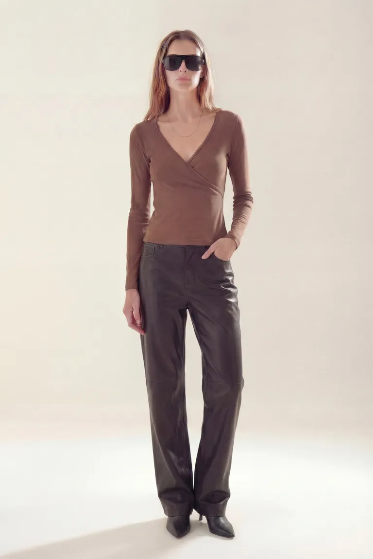 Remera de manga larga con diseño cruzado en el frente y escote en V. Una prenda versátil, cómoda y de calce ajustado ideal para completar diversos outfits casuales o formales durante todo el año.